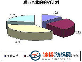 據(jù)調(diào)查,37%的企業(yè)計劃快購快銷,主要是因為后期棉花上漲速度減緩,紡企春節(jié)前訂單生產(chǎn)基本集中在上月和本月,但是原料儲備采購集中在10月和11月。另外國家宏觀調(diào)控方面,發(fā)改委多次表示力保棉花市場相對穩(wěn)定和紡企用棉需求,新疆棉運(yùn)輸也要積極協(xié)調(diào)加快其出貨速度。預(yù)計后期在政府調(diào)控新疆棉資源將大量出貨,也會對內(nèi)地棉價可能形成沖擊。預(yù)計后期棉花將出現(xiàn)小的通脹局面,棉價上漲動力將不足,因此加緊銷售控制風(fēng)險很必要;27%的企業(yè)因為市場資源不多且收購基本掃尾,資源有限情況下打算放緩收購;23%的企業(yè)準(zhǔn)備適量存貨,主要是前期銷售的皮棉庫存較早,目前棉價上漲較遲緩,但是今年情況不同以往,比較特殊,企業(yè)還打算后期再投資參與,囤積一部分皮棉到2010年5、6月銷售;13%的企業(yè)選擇暫時觀望,認(rèn)為當(dāng)前上漲速度慢,并且?guī)в懈有浴D壳笆袌鲚^難以把握,認(rèn)為先觀望認(rèn)清市場再做下一步打算。(如下圖)