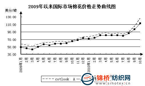 受巴基斯坦洪澇災(zāi)害、2010/11年度全球棉花庫存繼續(xù)下降、全球農(nóng)產(chǎn)品集體漲價的拉動作用等因素影響,國際市場棉價從7月中旬開始快速上升,8月、9月英國展望指數(shù)環(huán)比分別上升7.36%、15.92%,美棉期貨價格環(huán)比分別上升8.34%、11.49%。10月棉價繼續(xù)大幅上升,英國展望指數(shù)、美棉期貨月均價分別127美分/磅、113美分/磅,分別比上月上升20.83%、16.88%,與2009年同期相比分別上升89.39%、72.83%。10月26日兩者價格分別升至歷史最高價位的147美分/磅、130美分/磅,與本輪上漲初期的7月中旬價格相比分別上升76.68%、68.48%。