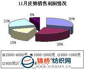 調(diào)查顯示,11月國內(nèi)棉花現(xiàn)貨價格均價較上月漲幅在2000元/噸左右。但是過山車般的行情使企業(yè)的經(jīng)營出現(xiàn)很大差異。一些前期低位收購的企業(yè)利潤情況還可以,但是月內(nèi)高位收購的企業(yè)加工后銷售則明顯購銷倒掛,不過購銷倒掛的企業(yè)多數(shù)堅持囤積惜售,期盼年后順價銷售。棉企經(jīng)營風險加大。調(diào)查顯示,銷售利潤在2000-4000的企業(yè)占到30%,較上月減少7個百分點;1000-2000的企業(yè)占到26%,較上月減少3個百分點;800元以下的占23%,;銷售利潤在800-1000元的占15%,較上月減少5個百分點;還有6%的企業(yè)屬于保本無利。(如下圖2月銷售利潤對比)
