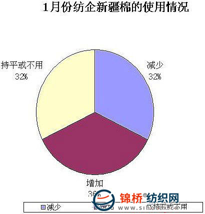 4.棉紡企業(yè)新疆棉占總用棉比重:據(jù)統(tǒng)計,至1月底新疆1級、2級站臺上的棉花約180多萬噸,但是其中有20多噸是國儲棉,并且需要提前發(fā)放,9-10月優(yōu)先發(fā)運2008/09年度國儲棉,使棉企運輸受到一定制約。新疆2、3級棉內(nèi)地倉庫存報價普遍在15700-15800元/噸、15400-15500元/噸,明顯高于地產(chǎn)棉300元/噸以上,因此1月紡企采購新疆棉積極性下降。由于調(diào)查樣本大多集中在大中型企業(yè),2萬錠以下企業(yè)較少,因此使用新疆棉比重較實際情況略高。調(diào)查結(jié)果顯示,被調(diào)查企業(yè)中,35.6%企業(yè)增加新疆棉使用量,32%減少。紡企新疆棉占總用棉比重由12月底的54.50%增加至11月底的52.10%。
