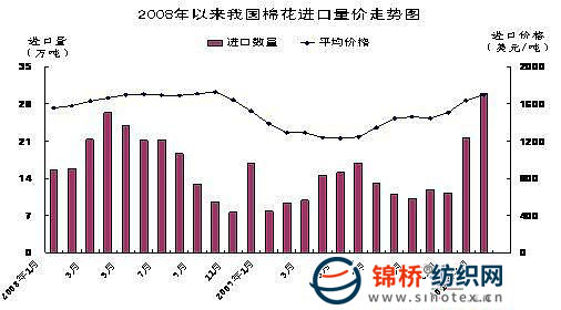 據(jù)海關(guān)統(tǒng)計(jì),2010年1月我國進(jìn)口棉花30.1萬噸,價(jià)值5.1億美元,分別比去年同期(下同)增長2.9倍和3.7倍;進(jìn)口均價(jià)1699美元/噸,上漲22.5%。