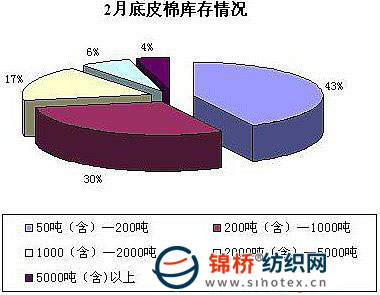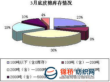 2010年3月國(guó)內(nèi)棉花現(xiàn)貨市場(chǎng)又出現(xiàn)一輪新的上漲行情,皮棉銷售情況普遍好轉(zhuǎn),紡織市場(chǎng)也出現(xiàn)轉(zhuǎn)暖跡象,紡織紗線價(jià)格大幅上漲,紡企開機(jī)率上升。月內(nèi)新疆棉運(yùn)輸仍然沒有明顯改觀,這同時(shí)也是棉價(jià)上漲的另一主要原因。3月冀魯豫地區(qū)收購(gòu)仍然繼續(xù),棉價(jià)大幅上漲對(duì)收購(gòu)市場(chǎng)起到積極推動(dòng)作用。一些小棉企銷售積極,但是大棉企惜售情緒依舊較濃,棉花資源向部分大企業(yè)集中。為全面了解3月棉企的庫存、銷售、資金及對(duì)市場(chǎng)預(yù)期等情況,進(jìn)行相應(yīng)調(diào)查。 1.商業(yè)庫存總量325萬噸 通過對(duì)棉企進(jìn)行分省、分規(guī)模抽樣調(diào)查,據(jù)統(tǒng)計(jì),截止2010年3月底,國(guó)內(nèi)棉花商業(yè)庫存總量325萬噸(包括外棉和進(jìn)入流通環(huán)節(jié)的棉花,不包括國(guó)儲(chǔ)棉),較2月底的351萬噸減少26萬噸。其中內(nèi)地商業(yè)庫存185萬噸,新疆商業(yè)庫存(未出疆)140萬噸。內(nèi)地產(chǎn)區(qū)中,黃河流域的冀魯豫3省共有庫存105萬噸,長(zhǎng)江流域的蘇皖鄂湘4省共有庫存60萬噸,其他分散產(chǎn)區(qū)20萬噸。 2.庫存量小幅下降 小棉企出貨速度快。 3月國(guó)內(nèi)棉花現(xiàn)貨價(jià)格一路上漲,皮棉出貨情況進(jìn)一步好轉(zhuǎn),一些大型紡企隨著訂單增加,原料急需補(bǔ)庫,因此在本月積極入市采購(gòu),中小紡企則因?yàn)橘Y金制約保持隨用隨買。棉企順價(jià)銷售積極,在本月出貨小幅加快。據(jù)調(diào)查,不少中小庫存幾乎全部銷售殆盡,少量棉企認(rèn)為存在價(jià)格優(yōu)勢(shì),適當(dāng)又增加庫存。據(jù)調(diào)查,截止3月底,36%的企業(yè)庫存量在200-1000噸,較上月增加6個(gè)百分點(diǎn);31%的企業(yè)庫存量在200噸以下,較上月減少12個(gè)百分點(diǎn)(其中包含零庫存);19%的企業(yè)庫存量在1000-2000噸,較上月增加2個(gè)百分點(diǎn);10%的企業(yè)庫存量在2000-5000噸,較上月增加4個(gè)百分點(diǎn);還有4%的企業(yè)庫存量在5000噸以上,與上月持平。(如下圖)