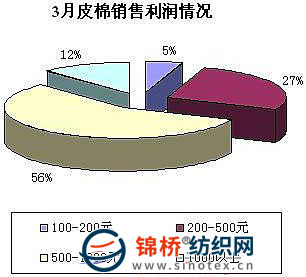 3.銷售利潤(rùn)可觀一半多企業(yè)銷售利潤(rùn)在500元以上 調(diào)查顯示,3月國(guó)內(nèi)棉花現(xiàn)貨市場(chǎng)行情一片大好,在下游紗線市場(chǎng)和電子盤齊漲的支撐下,現(xiàn)貨價(jià)格上漲較快。而本月內(nèi)多數(shù)棉企積極出貨,銷售利潤(rùn)非??捎^。其中56%的企業(yè)銷售利潤(rùn)在500-1000元;27%的企業(yè)銷售利潤(rùn)在200-500元;12%的企業(yè)銷售利潤(rùn)在1000元以上;僅有5%的企業(yè)銷售利潤(rùn)在100-200元。(如下圖)