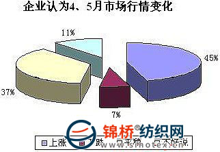 4.企業(yè)對(duì)后市信心高漲 認(rèn)為4、5月皮棉現(xiàn)貨仍然將上漲 3月紡織業(yè)轉(zhuǎn)暖,入市采購(gòu)企業(yè)有所增加。國(guó)內(nèi)棉花資源進(jìn)一步下降并大都集中在少數(shù)囤棉者手里,棉花經(jīng)過這一輪上漲,多數(shù)企業(yè)認(rèn)為4、5月棉花上漲仍然待繼續(xù)。大部分對(duì)市場(chǎng)上漲信心有增無減。調(diào)查顯示,對(duì)于4、5月皮棉行情,45%的企業(yè)認(rèn)為上漲,較上增加9個(gè)百分點(diǎn);37%的企業(yè)認(rèn)為以平穩(wěn)為主,較上月增加12個(gè)百分點(diǎn);11%的企業(yè)認(rèn)為不好說,較上月減少15個(gè)百分點(diǎn);7%的企業(yè)認(rèn)為下跌,較上月減少6個(gè)百分點(diǎn)。(如下圖)