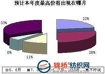 6.企業(yè)認(rèn)為本年度最高價(jià)格線17000元/噸 從調(diào)查企業(yè)來看,大多數(shù)企業(yè)認(rèn)為本年度標(biāo)準(zhǔn)級(jí)棉花最高價(jià)線能夠突破17000元/噸,最低價(jià)線16000元/噸;預(yù)計(jì)本年度棉花最高價(jià)將出現(xiàn)在7、8月,具體情況如:33%的企業(yè)認(rèn)為不好說;28%的企業(yè)認(rèn)為最高價(jià)將出現(xiàn)在7、8月;22%的企業(yè)認(rèn)為將出現(xiàn)在5、6月;還有11%的企業(yè)認(rèn)為將出現(xiàn)在6、7月;只有6%的企業(yè)認(rèn)為出現(xiàn)在9月。(如下圖)