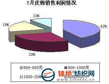 3、棉企銷售利潤(rùn)進(jìn)一步提高。 調(diào)查顯示,5月全國(guó)農(nóng)產(chǎn)品價(jià)格大幅度上漲,棉花現(xiàn)貨漲幅較4月加強(qiáng)。棉企銷售利潤(rùn)得到大幅度提升。據(jù)調(diào)查,當(dāng)月42%的被調(diào)查企業(yè)銷售利潤(rùn)在500-800元;29%的企業(yè)銷售利潤(rùn)在800-1000元;19%的企業(yè)銷售利潤(rùn)在1000-2000元;10%的企業(yè)銷售利潤(rùn)達(dá)2000元以上。(如下圖)