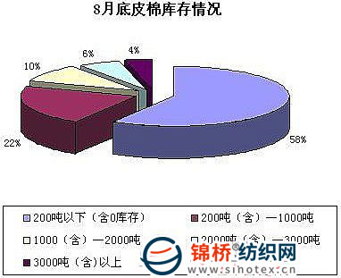 8月隨著棉企加大銷售力度,存棉較多的企業(yè)庫存量向中等偏低水平轉(zhuǎn)移。調(diào)查獲悉,截至8月末庫存在200噸以下的企業(yè)占58%,較上月增加4個百分點;200-1000噸的企業(yè)占22%,較上月增加1個百分點;1000-2000噸的企業(yè)占10%,較上月減少7個百分點;2000-3000噸的企業(yè)占6%,與上月持平;還有4%的企業(yè)庫存在3000噸較上月增加2個百分點。