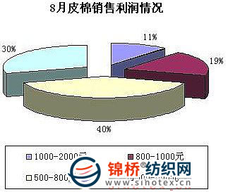 調(diào)查顯示,8月國內(nèi)棉花現(xiàn)貨價格跌幅在200元左右。棉花銷售利潤繼續(xù)縮減。其中40%的企業(yè)銷售利潤在500-800元,較上月增加2個百分點;30%的企業(yè)銷售利潤在300-500元,較上月增加17個百分點;19%的企業(yè)銷售利潤在800-1000元,較上月減少7個百分點;11%的企業(yè)銷售利潤在1000-2000元,較上月減少12個百分點。(如下圖)