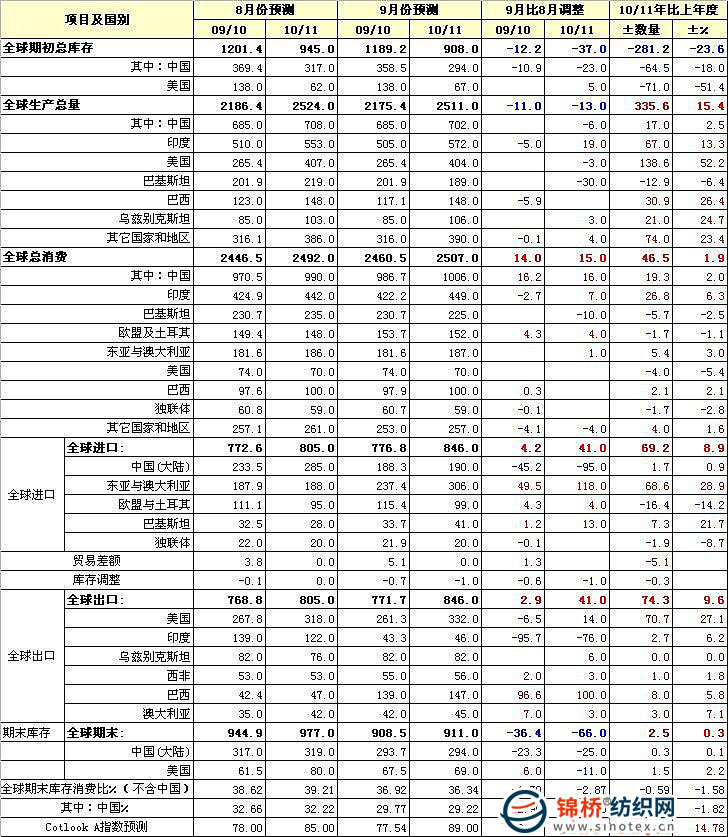 9月1日發(fā)布了最新一期報(bào)告:2010/11年度,全球棉花產(chǎn)量將反彈15%,而紡織用棉量會(huì)增長(zhǎng)2%,因此全球棉花產(chǎn)需預(yù)計(jì)會(huì)大體平衡在2510萬噸。全球期末庫(kù)存有望保持在910萬噸,而庫(kù)存消費(fèi)比會(huì)由37%下降為36%,是自1989/90年度以來的最低值??捎脦?kù)存緊張推動(dòng)棉價(jià)走高。 預(yù)計(jì)美棉2010/11年度產(chǎn)量為400萬噸,比上年度增長(zhǎng)52%,推動(dòng)全球棉花產(chǎn)量反彈。中國(guó)大陸和印度將占全部紡織用棉量增長(zhǎng)的絕大部分。