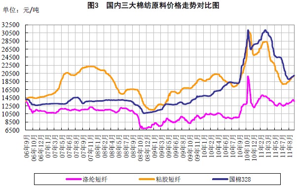 2011年三季度,棉花市場(chǎng)主要呈現(xiàn)以下幾個(gè)特點(diǎn):一新棉上市較早,豐產(chǎn)預(yù)期較大;二是棉紡原料價(jià)差回歸,紡織企業(yè)用棉比例可能增加;三是進(jìn)口棉價(jià)格回歸,低等級(jí)外棉價(jià)格優(yōu)勢(shì)體現(xiàn);四是紡織出口量縮價(jià)增,用棉需求短期難以明顯增加;五是臨時(shí)收儲(chǔ)政策對(duì)棉價(jià)產(chǎn)生支撐,但收儲(chǔ)節(jié)奏影響新棉收購(gòu)價(jià)格;六是經(jīng)濟(jì)增長(zhǎng)降速,人民幣對(duì)美元匯率或加速升值,對(duì)中小紡織企業(yè)不利。