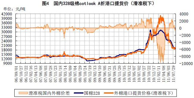 進(jìn)口棉市場(chǎng)回暖,外棉優(yōu)勢(shì)體現(xiàn)。受中國(guó)收儲(chǔ)政策影響,ICE期棉遠(yuǎn)、近月合約價(jià)差縮小,目前在95-105美分附近震蕩,外棉期現(xiàn)基差逐步縮小在10美分左右。外棉進(jìn)口價(jià)格由二季度最高比國(guó)內(nèi)價(jià)格高8000元/噸逐漸回歸,目前與國(guó)內(nèi)現(xiàn)貨價(jià)格略低或持平,外棉價(jià)格優(yōu)勢(shì)再度顯現(xiàn)。由于預(yù)期2011年度中國(guó)將加大棉花進(jìn)口,8月份進(jìn)口棉配額價(jià)格已略有走高。