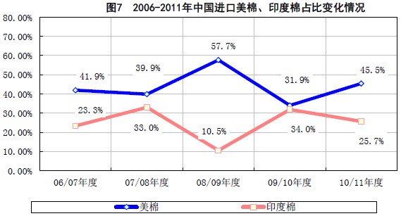 2、美國(guó)及印度的棉花出口情況。預(yù)計(jì)中國(guó)將在2011年度增大棉花進(jìn)口補(bǔ)充國(guó)庫(kù)以滿足紡織用棉需求。中國(guó)從美國(guó)及印度進(jìn)口棉花的比例占進(jìn)口總量的65%以上,但美國(guó)主要棉區(qū)減產(chǎn)及印度棉花出口政策不確定給2011年度的進(jìn)口市場(chǎng)增加了不確定性。應(yīng)積極關(guān)注美國(guó)新棉產(chǎn)量及質(zhì)量,印度棉花出口政策的變化也需及時(shí)關(guān)注。2011年度,國(guó)內(nèi)紡織企業(yè)可能積極從多個(gè)國(guó)家采購(gòu)?fù)饷蓿惯M(jìn)口棉市場(chǎng)呈現(xiàn)多樣化的特點(diǎn)。