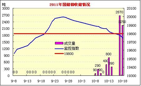 10月18日計(jì)劃收儲(chǔ)31500噸,實(shí)際成交2250噸,其中新疆庫(kù)成交1800噸,內(nèi)地庫(kù)成交450噸,截止目前2011年度棉花臨時(shí)收儲(chǔ)累計(jì)成交7070噸。今日成交主要集中在新疆、湖北、安徽三地。