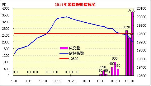 10月19日計劃收儲33000噸,實際成交3780噸,其中新疆庫成交3000噸,內(nèi)地庫成交780噸,截止今日2011年度棉花臨時收儲累計成交噸10850噸,新疆累計成交8080噸,內(nèi)地累計成交2770噸。今日成交主要集中在新疆、湖北、安徽江蘇、天津五省倉庫。