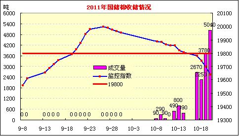 10月20日計劃收儲33000噸,實際成交5040噸,其中新疆庫成交4200噸,內(nèi)地庫成交840噸,截止今日2011年度棉花臨時收儲累計成交15890噸,新疆累計成交12280噸,內(nèi)地累計成交3610噸。今日成交主要集中在新疆、湖北、安徽江蘇、天津五省市倉庫。