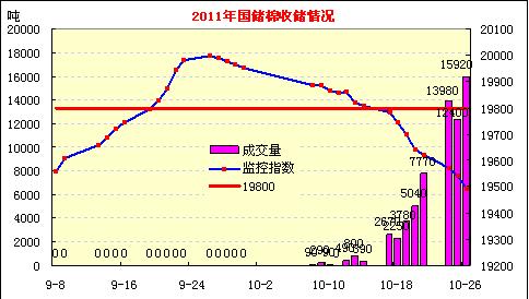 10月26日計(jì)劃收儲36000噸,實(shí)際成交15920噸,成交比例44%。其中新疆庫計(jì)劃收儲17400噸,實(shí)際成交12170噸,成交比例70%;內(nèi)地庫計(jì)劃收儲18600噸,實(shí)際成交3750噸,成交率20%。截止今日2011年度棉花臨時(shí)收儲累計(jì)成交65960噸,新疆累計(jì)成交51250噸,內(nèi)地累計(jì)成交14710噸。今日成交主要集中在新疆(12080)、天津(270)、湖北(2280)、湖南(300)、安徽(510)、江西(120)、河北(360)等六省市倉庫,成交范圍逐步擴(kuò)大。