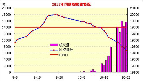 10月28日計劃收儲35000噸,實(shí)際成交15680噸,成交比例45%。其中新疆庫計劃收儲15800噸,實(shí)際成交11480噸,成交比例73%;內(nèi)地庫計劃收儲19200噸,實(shí)際成交4200噸,成交率22%。截止今日2011年度棉花臨時收儲累計成交96060噸,新疆累計成交73160噸,內(nèi)地累計成交22900噸。從國家公布的13個主產(chǎn)區(qū)庫點(diǎn)來看,除山西、陜西、甘肅三省尚未交儲外,其余主產(chǎn)棉區(qū)均已陸續(xù)開始成交。今日交儲地主要有:河北(90)、湖北(2850)、湖南(600)、江蘇(90)、江西(90)、山東(180)、天津(300)、新疆(11480)。