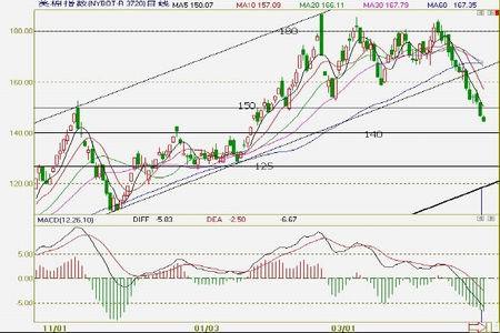 圖為美棉指數(shù)日K 線走勢圖。 在3 月31 日美國農(nóng)業(yè)部公布的2011/12 年度棉花種植報告中,美國棉花播種預(yù)估遠(yuǎn)低于市場預(yù)期,無法緩解市場對于棉花的供應(yīng)憂慮,4 月初,美棉價格在此項(xiàng)報告的提振下震蕩上行,在均線系統(tǒng)的技術(shù)支撐下,于2 月份以來第四次上沖前高180 美分一線附近。4 月上旬,美棉于高位區(qū)間遭遇較強(qiáng)壓力,上漲動能衰退,沖高回落。南半球棉花開始采摘并即將上市供應(yīng)以及中國棉花市場疲軟等因素令美棉承壓,截至4 月27 日,美棉以13 陰線夾1 個十字線陽叉的走勢徹底告別了前期上行通道及高位震蕩區(qū)間,步入下行通道中,均線系統(tǒng)重新排列,令美棉盤面技術(shù)壓力增加。短期關(guān)注美棉指數(shù)150 美分/磅附近,若跌破該支撐,則后市關(guān)注下方125––140 美分/磅區(qū)間附近的支撐,該區(qū)間將對盤面形成重要支撐。建議關(guān)注其間量倉的變化狀況。 (北京中期 許晶) |