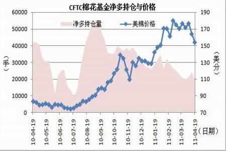 圖為歷周美國棉花周度種植率比較圖。 未來需密切關(guān)注新棉播種期的天氣狀況,若天氣良好,則播種率或?qū)⒕S持于較高水平,進(jìn)而增加了年終增產(chǎn)的可能性,進(jìn)而將令美棉價格承壓。 三、4 月CFTC 基金凈多持倉量環(huán)比減少,美棉價格頹勢難擋 由美國商品期貨交易委員會(CFTC)公布的截止4 月19 日當(dāng)周的棉花基金凈持倉情況與棉花指數(shù)價格進(jìn)行比較(如圖3-1 所示),可以看出, CFTC 基金總持倉量環(huán)比減少,多頭空頭雙雙減少,截至4 月19 日當(dāng)周凈多持倉量較3 月29 日當(dāng)周小幅減少300 手左右。 截至4 月19 日當(dāng)周,美棉指數(shù)周收盤價為153.96 美分/磅,較3 月29 日當(dāng)周收盤價跌幅高達(dá)10.3%,主要受到主力5 月合約到期交割平倉的壓力影響。目前價格與基金凈多持倉走勢趨于一致,若后市基金凈多頭持倉量持續(xù)減少,則棉價下跌空間或?qū)U(kuò)大。 圖3-1:截至4 月19 日當(dāng)周CFTC 棉花基金凈多頭寸與美棉價格的走勢圖
