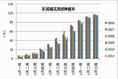 一、4 月,南半球棉花采摘順利,預(yù)期將有效緩解供應(yīng)壓力 4月份,南美的棉花、澳棉和局部非洲的棉花正值采摘時節(jié),5月份澳棉、南美棉及非洲棉將先后上市供應(yīng),目前澳棉和巴西棉產(chǎn)量基本已成定局,5月份和7月份將分別有零星的澳棉和巴西棉裝運(yùn),因此當(dāng)前市場南半球棉花報價逐漸增多。 目前業(yè)內(nèi)預(yù)期2010/11年度南半球的澳棉產(chǎn)量或?qū)⑦_(dá)到90萬噸以上。雖然本年初澳大利亞的強(qiáng)降雨天氣,曾引起業(yè)內(nèi)的澳棉產(chǎn)量的擔(dān)憂,但最終可見棉區(qū)受到影響程度較為有限。 截至4月中旬,昆士蘭中部棉區(qū)已采摘四分之三的棉花,西部棉區(qū)采摘約有一半。受之前洪水等惡劣天氣的影響,棉花的單產(chǎn)不佳。 2010/11年度巴西棉花種植面積和單產(chǎn)均有提高,因此巴西棉產(chǎn)量或?qū)⑦_(dá)到200萬噸左右的水平。巴西棉花咨詢委員會(CONAB)最新預(yù)測2010/11年度棉花產(chǎn)量為202.76萬噸,較上月調(diào)增7.74萬噸,較2009/10年度產(chǎn)量增加69.8%。巴西棉花出口商協(xié)會(ANEA)預(yù)測為199萬噸。7月份開始,巴西棉將從有零星出口,但大量裝運(yùn)將在8月份以后開始。 二、截至4 月第3 周,2011/12 年度美國棉花周度種植率同比增長 圖2-1:2006 年至今歷周美國棉花周度種植率比較圖