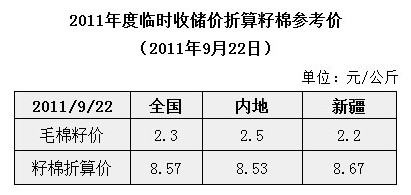2011年度臨時(shí)收儲(chǔ)價(jià)折算籽棉參考價(jià)(2011年9月22日)