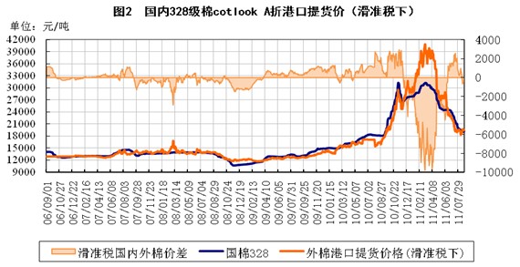 受中國收儲政策影響,ICE期棉遠、近月合約價差縮小,目前在95-105美分附近震蕩,外棉期現(xiàn)基差逐步穩(wěn)定在10美分左右。外棉進口價格由二季度最高比國內(nèi)價格高8000元/噸逐漸回歸,目前與國內(nèi)現(xiàn)貨價格略低或持平,外棉價格優(yōu)勢再度顯現(xiàn)。由于預期2011年度中國將加大棉花進口,8月份進口棉配額價格已經(jīng)略有走高。