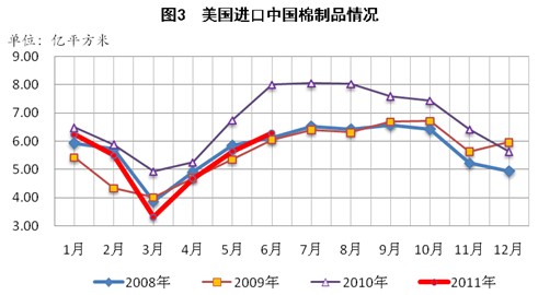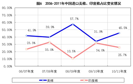 2、美國及印度的棉花出口情況。預計中國將在2011年度增大棉花進口補充國庫以滿足紡織用棉需求。中國從美國及印度進口棉花的比例占進口總量的65%以上,但美國主要棉區(qū)減產(chǎn)及印度棉花出口政策不確定給2011年度的進口市場增加了不確定性。應積極關注美國新棉產(chǎn)量及質(zhì)量,印度棉花出口政策的變化也需及時關注。2011年度,國內(nèi)紡織企業(yè)可能積極從多個國家采購外棉,使進口棉市場呈現(xiàn)多樣化的特點。