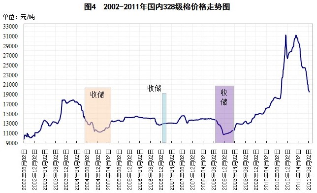 與往年棉花收儲政策不同,2011年的臨時收儲預案的特點主要有二:一是限價不限量,符合要求的皮棉均可交儲,在臨時收儲預案實施期間,約有120個工作日,按照以往每日收儲2萬噸計算,若每日收儲計劃全部完成,則可收儲240萬噸,相當于全國1/3的產(chǎn)量,足以影響市場供需關系;二是將籽棉收購價、棉籽價格與皮棉價格走勢聯(lián)動起來,對棉農(nóng)種棉收益形成一定的保護,臨時收儲的執(zhí)行時間也同時是新棉集中上市、收購、加工的時間。主要也是為保護棉農(nóng)的利益,穩(wěn)定國內(nèi)棉花供應。