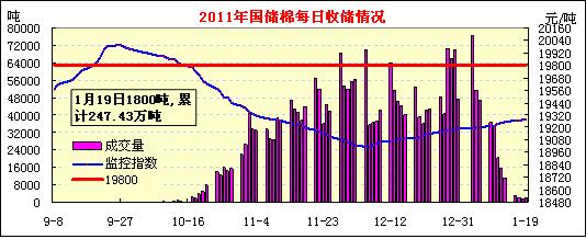 1月19日計(jì)劃收儲(chǔ)120300噸,實(shí)際成交1800噸,日成交量維持在一千余噸,全部為內(nèi)地庫點(diǎn)成交。春節(jié)前企業(yè)陸續(xù)停工,交儲(chǔ)市場清淡依舊,新疆庫點(diǎn)連續(xù)5日保持零成交。截止今日2011年度棉花臨時(shí)收儲(chǔ)累計(jì)成交2474280噸,新疆累計(jì)成交1518600噸,內(nèi)地累計(jì)成交955680噸。
