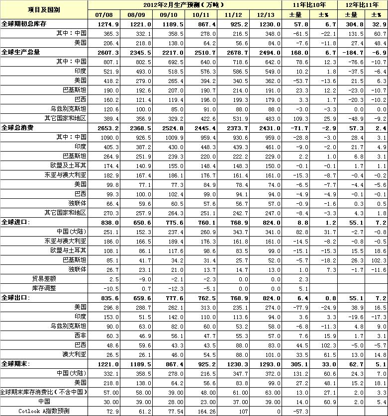 由于2011/12年度棉花供應大量過剩,全球棉花庫存回升到1230萬噸,同比增加三分之一,其中超過40%的增長來自中國。從2011年10月8日至2012年1月20日,中國累計收儲250萬噸國產棉。此外,有報道稱中國還收儲了約100萬噸進口棉。2012/13年度,全球棉花產量預計超過消費量,期末庫存將繼續(xù)上升到1290萬噸,因此棉價維持在目前的水平有難度。
