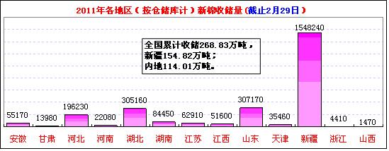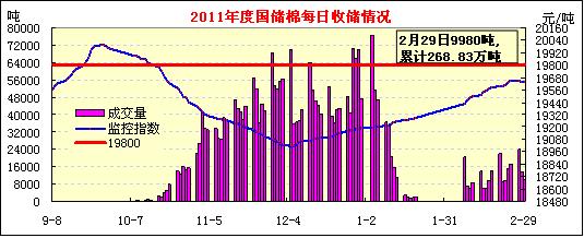 2月29日計(jì)劃收儲100000噸,實(shí)際成交9980噸,成交比例10%;較上一成交日減少3560噸。其中,新疆庫點(diǎn)計(jì)劃收儲24800噸,實(shí)際成交2960噸,成交率12%;內(nèi)地庫計(jì)劃收儲75200噸,實(shí)際成交7020噸,成交率9%。截止今日2011年度棉花臨時(shí)收儲累計(jì)成交2688330噸,新疆累計(jì)成交1548240噸,內(nèi)地累計(jì)成交1140090噸。