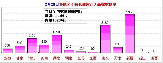 按倉儲庫收儲地區(qū)匯總:當(dāng)日收儲較多的地區(qū)有:新疆2960噸,占29.7%,山東2160噸,占21.6%,湖北1350噸,占13.5%,河北1110噸,占11.1%等。截止2月29日,新疆庫累計(jì)收儲154.82萬噸,占57.6%、山東30.72萬噸,占11.4%、湖北30.52萬噸,占11.4%、河北19.62萬噸,占7.3%等。