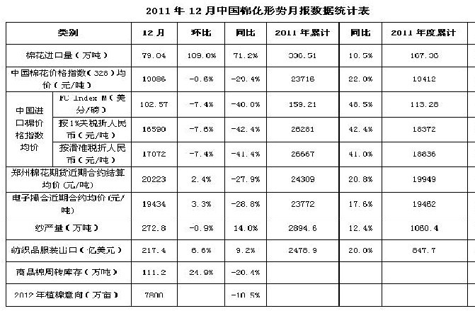 2011年,全球經(jīng)濟形勢復雜多變,國際貿(mào)易增速回落。受原材料、勞動力價格大幅上漲、出口增速放緩等因素影響,我國紡織行業(yè)運行艱難,棉花消費減少。上半年棉花價格劇烈波動,在年初短暫沖高后大幅回落。國家實施臨時收儲政策,收儲數(shù)量約占總產(chǎn)量的1/3,對穩(wěn)定國內(nèi)棉花市場、保護棉農(nóng)利益發(fā)揮了重要作用,棉花市場趨于穩(wěn)定。 棉花供給。受上年棉價水平總體較高影響,2011年全國植棉面積增加。大部棉區(qū)氣象條件總體適宜,棉花增產(chǎn)。國家統(tǒng)計局統(tǒng)計,2011年全國棉花產(chǎn)量660萬噸,同比增長10.7%(中國棉花協(xié)會統(tǒng)計,全國棉花產(chǎn)量728萬噸,同口徑比較,增長9.3%)。當年進口棉配額發(fā)放較為充裕,年底受國內(nèi)外價差拉大影響,進口量大幅飆升,全年進口棉花336.5萬噸,同比增長18.5%。 紡織形勢。紡織行業(yè)面臨多種不利因素影響,雖然從數(shù)據(jù)上看,全年生產(chǎn)、出口及利潤仍然平穩(wěn)增長,但增速逐月下滑,多數(shù)指標增幅低于上年,行業(yè)運行壓力加大,特別是中小企業(yè)經(jīng)營困難。國家統(tǒng)計局統(tǒng)計,2011年規(guī)模以上紡織工業(yè)增加值增長8.3%,增幅同比回落3.3個百分點;主要紡織品產(chǎn)量保持平穩(wěn)增長,其中紗產(chǎn)量累計2894.6萬噸,同比增長12.4%,增幅同比回落1.1個百分點;紡織品服裝出口繼續(xù)增長,但8月之后增速下降較快,海關(guān)統(tǒng)計,我國全年紡織品服裝出口2479億美元,同比增長20%,增幅較上年下降3.6個百分點;內(nèi)需支撐作用增強,國內(nèi)銷售總體維持穩(wěn)定,限額以上企業(yè)(單位)服裝鞋帽、針紡織品零售總額7955億元,同比增長24.2%,增幅下降0.6個百分點。 價格走勢。2011年國內(nèi)棉花價格先漲后落,3月初最高達到31000元/噸左右,接近上年高點,后持續(xù)回落,一度跌幅加劇,12月初最低跌至19000元/噸附近,后在國家收儲政策支撐之下在19200元/噸左右企穩(wěn)。中國棉花價格指數(shù)(CCIndex328級)年均價23716元/噸,同比上漲22%。 新棉收購。進入新棉花年度,棉花企業(yè)入市謹慎,棉農(nóng)惜售情緒較重,購銷一度處于僵持狀態(tài)。9月8日,臨時收儲預案啟動,企業(yè)交儲積極性提高,將主要銷售渠道轉(zhuǎn)向交儲,截止12月31日,2011年度棉花臨時收儲累計成交217萬噸,約占全國產(chǎn)量近30%。隨著成交量逐步增多,市場價格止跌企穩(wěn),各方信心有所恢復,帶動收購價格趨穩(wěn),棉農(nóng)交售積極性提高,收購進度明顯加快,截止年底,全國棉農(nóng)平均交售進度超過八成,其中新疆棉區(qū)交售基本結(jié)束。 2012年植棉意向。盡管有收儲政策托市,但由于棉花價格與前一年相比大幅回落,加之植棉成本上升、收益減少、用工過多,棉農(nóng)植棉積極性受挫,中國棉花協(xié)會調(diào)查,2012年近四成棉農(nóng)準備減少種植面積,四成與上年持平,少量準備增加面積或仍在徘徊,按照被調(diào)查棉農(nóng)植棉意向加權(quán)平均計算,全國棉農(nóng)平均種植意向減少10.5%,其中收儲執(zhí)行到位的地區(qū)植棉意向下降幅度較小,收儲量少的地區(qū)下降幅度較大。