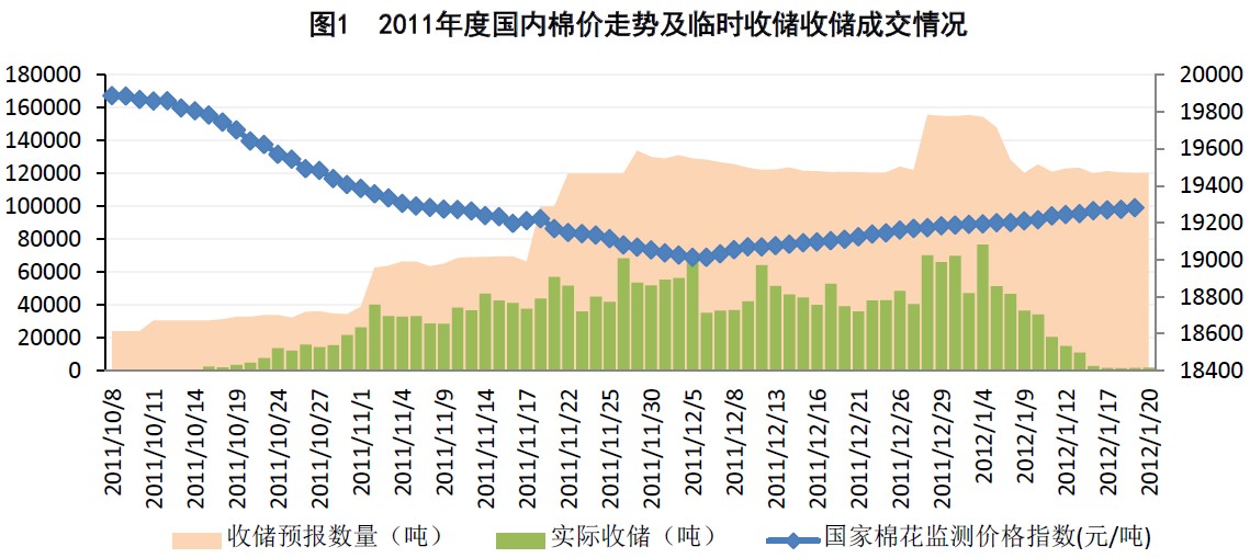 另外,截止1月20日,國家累計(jì)收儲(chǔ)2011年度國產(chǎn)棉247.626萬噸,雖然明顯改善了國內(nèi)棉市的供求關(guān)系,但是尚不能對(duì)國內(nèi)棉市產(chǎn)生決定性的影響。1月16-20日一周,國內(nèi)收儲(chǔ)累計(jì)成交不足前一周收儲(chǔ)成交量的1/10。若期棉價(jià)格繼續(xù)上漲,交儲(chǔ)的吸引力將繼續(xù)下降,收儲(chǔ)對(duì)市場(chǎng)的支撐作用將明顯減弱。