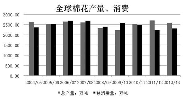 美國農業(yè)部最新月度供需報告顯示,2012/2013年度全球棉花總產量約為2589.9萬噸,總消費量為2313.1萬噸,供需過剩量為276.8萬噸,同比減少181.4萬噸。全球棉花雖仍處于供給相對寬松格局,但供需過剩量已有所收窄,未來棉價將由新年度的種植情況及供需結構決定。
