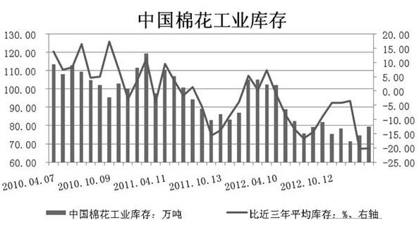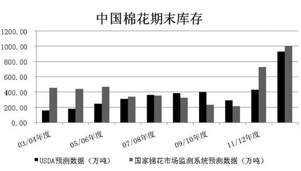 國家棉花市場監(jiān)測系統(tǒng)數(shù)據(jù)顯示,2012/2013年度中國棉花的期末庫存總量高達1004.10萬噸,同比增加279.5萬噸,增幅為38.57%,并創(chuàng)下歷史新高,幾乎為2010/2011年度棉花期末庫存總量的5倍。且美國農業(yè)部的預測數(shù)值也高達927.8萬噸,雖低于國內機構統(tǒng)計量,但也處歷史最高水平。