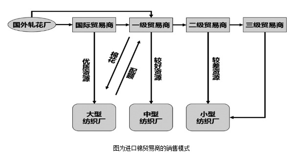 據(jù)記者調(diào)研了解,進(jìn)口棉貿(mào)易商的銷售模式又可以根據(jù)其采購模式的不同分為三類。對于國際棉花貿(mào)易商而言,其采購的棉花基本被國內(nèi)大型棉花貿(mào)易商和大型棉紡織企業(yè)瓜分,其獲利能力強(qiáng),利潤空間大。國內(nèi)一級棉花貿(mào)易商從國際貿(mào)易商手中接到棉花后,首先在自己內(nèi)部的圈子里,比如業(yè)務(wù)關(guān)系好的紡織企業(yè)和貿(mào)易企業(yè),消化優(yōu)質(zhì)資源,再將剩余的棉花資源銷售給二級、三級貿(mào)易商,其獲利能力比較穩(wěn)定。國內(nèi)二級、三級棉花貿(mào)易商處于被動地位,其中少部分規(guī)模稍大點的企業(yè)會采購一部分棉花,自己做貿(mào)易,多數(shù)小企業(yè)則是進(jìn)行報價倒賣交易,銷售對象往往是規(guī)模較小的紡織企業(yè),其獲取的利潤微薄。