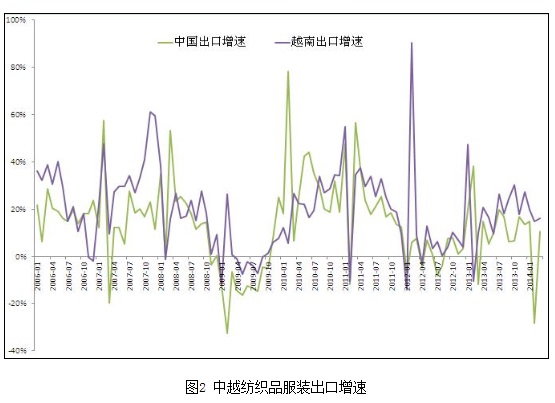 中國作為傳統(tǒng)的紡織品服裝出口國家,盡管2013年紡織品服裝出口也呈現(xiàn)增長態(tài)勢(shì),但增速在下降。2014年這一現(xiàn)象沒有好轉(zhuǎn),一季度,中國總的紡織品服裝出口同比增長僅0.4%。雖然中國對(duì)越南紡織品服裝出口同比增長20.88%,但顯然,中國的傳統(tǒng)市場份額已經(jīng)被越南侵蝕。