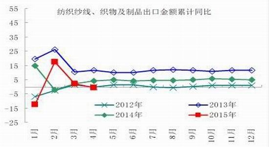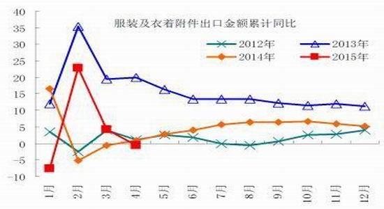 資料來(lái)源:華安期貨行業(yè)研究中心;中國(guó)棉花協(xié)會(huì) 圖4:4月進(jìn)口紗數(shù)量同比高位 資料來(lái)源:華安期貨行業(yè)研究中心;中國(guó)棉花協(xié)會(huì) 2.3紡織服裝出口增長(zhǎng)不及預(yù)期 海關(guān)總署最新數(shù)據(jù)顯示,2015年4月,我國(guó)出口紡織品服裝約198.76億美元,同比減少16.33%,環(huán)比增加58.19%。其中出口紡織紗線(xiàn)、織物及制品94.19億美元,同比減少10.76%,環(huán)比增加60.33%;出口服裝及衣著附件104.56億美元,同比減少20.78%,環(huán)比增加56.32%。2015年(1月-4月),我國(guó)紡織品服裝累計(jì)出口796.57億美元,較去年同期減少22.27億美元,同比減少2.72%。從下圖可以看出,4月份國(guó)內(nèi)紡織服裝出口數(shù)據(jù)并不是很樂(lè)觀,表明外圍需求還是很弱,但這是累計(jì)金額累計(jì)同比,在原材料成本大幅下降的背景下,金額下降也理所當(dāng)然。 圖5:紡織紗線(xiàn)、織物及制品出口金額累計(jì)同比回落