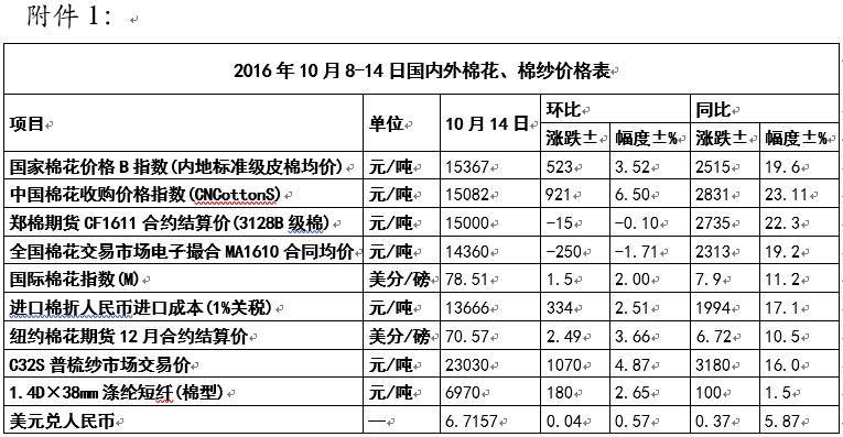 本周,新棉收購(gòu)價(jià)格大幅上漲后略有回落,皮棉價(jià)格先揚(yáng)后抑,期貨價(jià)格略跌。10月14日,內(nèi)地標(biāo)準(zhǔn)級(jí)皮棉銷售均價(jià)15367元/噸,較上周上漲523元/噸,漲幅3.52%,同比上漲2515元/噸,漲幅19.6%。全國(guó)棉花交易市場(chǎng)電子撮合交易10月合同均價(jià)14360元/噸,較上周下跌250元/噸,跌幅1.71%,同比上漲2313元/噸,漲幅19.2%。鄭州棉花期貨11月合約結(jié)算價(jià)15000元/噸,較上周下跌15元/噸,跌幅0.1%,同比上漲2735元/噸,漲幅22.3%。國(guó)內(nèi)3級(jí)籽棉收購(gòu)均價(jià)3.76元/斤(折皮棉15082元/噸),較上周上漲0.17元/斤(折皮棉上漲921元/噸),漲幅4.74%。同比上漲0.87元/斤(折皮棉2831元/噸),漲幅30.1%。其中,內(nèi)地籽棉收購(gòu)均價(jià)3.68元/斤(折皮棉14562元/噸,較上周上漲0.18元/斤(折皮棉上漲963元/噸),漲幅5.14%,同比上漲0.46元/斤(折皮棉2321元/噸),漲幅21.05%;新疆籽棉收購(gòu)均價(jià)3.8元/斤(折皮棉15298元/噸),較上周上漲0.18元/斤(折皮棉上漲929元/噸),漲幅4.97%,同比上漲0.99元/斤(折皮棉上漲3689元/噸),漲幅35.23%。