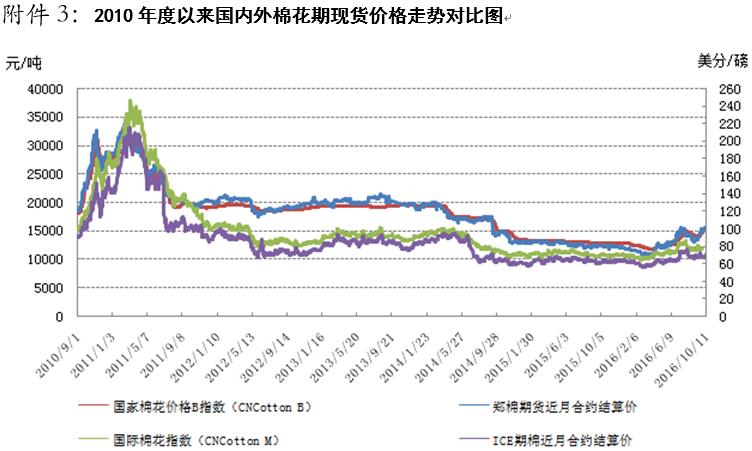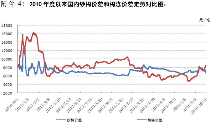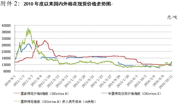 國(guó)內(nèi)棉價(jià)短期內(nèi)面臨調(diào)整壓力,市場(chǎng)風(fēng)險(xiǎn)加大。宏觀方面,據(jù)國(guó)家統(tǒng)計(jì)局最新數(shù)據(jù)顯示,9月份,全國(guó)工業(yè)生產(chǎn)者出廠價(jià)格同比上漲0.1%,結(jié)束了同比連續(xù)54個(gè)月下降的態(tài)勢(shì),自2012年3月以來(lái)首次由負(fù)轉(zhuǎn)正。全國(guó)居民消費(fèi)價(jià)格總水平同比上漲1.9%,漲幅比8月擴(kuò)大0.6個(gè)百分點(diǎn)。中國(guó)制造業(yè)采購(gòu)經(jīng)理指數(shù)(PMI)為50.4%,與上月持平,繼續(xù)高于臨界點(diǎn)。另外,據(jù)中國(guó)海關(guān)總署最新統(tǒng)計(jì)數(shù)據(jù)顯示,2016年9月,我國(guó)紡織品服裝出口額為227.64億美元,同比下降15.41%。1-9月,我國(guó)紡織品服裝累計(jì)出口額為1986.54億美元,同比下降5.96%。