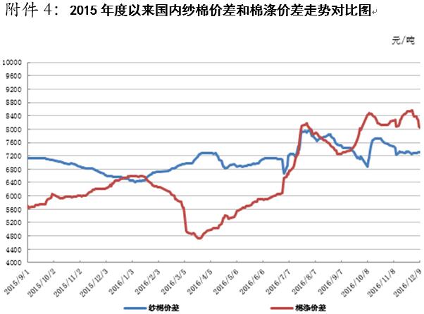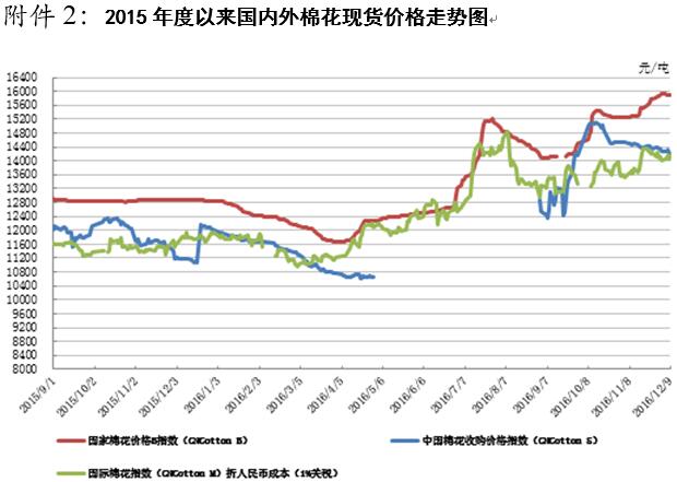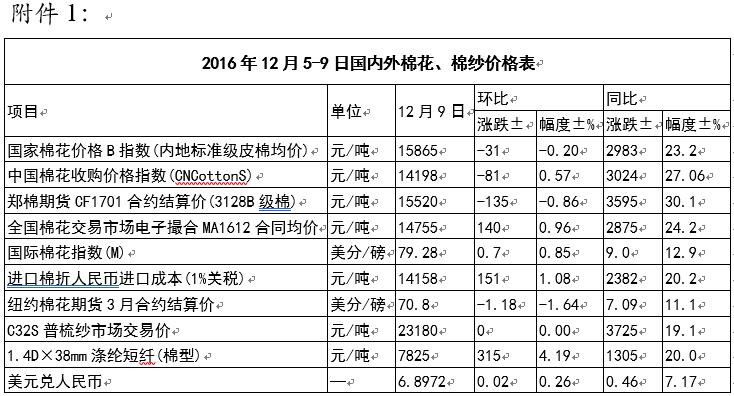 本周,新棉采摘基本結(jié)束,收購價格下跌,皮棉價格走勢偏弱。12月9日,內(nèi)地標(biāo)準(zhǔn)級皮棉銷售均價15865元/噸,較上周下跌31元/噸,跌幅0.2%,同比上漲2983元/噸,漲幅23.2%。全國棉花交易市場電子撮合交易12月合同均價14755元/噸,較上周上漲140元/噸,漲幅0.96%,同比上漲2875元/噸,漲幅24.2%。鄭州棉花期貨CF1701合約結(jié)算價15520元/噸,較上周下跌135元/噸,降幅0.86%,同比上漲3595元/噸,漲幅30.1%。國內(nèi)3級籽棉收購均價3.63元/斤(折皮棉14198元/噸),較上周下跌0.01元/斤(折皮棉下跌81元/噸),跌幅0.27%,同比上漲0.93元/斤,漲幅34.44%;內(nèi)地籽棉收購均價3.73元/斤(折皮棉14355元/噸),較上周下跌0.01元/斤(折皮棉下跌23元/噸),跌幅0.27%,同比上漲0.74元/斤,漲幅24.75%;新疆籽棉收購均價3.59元/斤(折皮棉14131元/噸),較上周下跌0.01元/斤(折皮棉下跌100元/噸),跌幅0.28%,同比上漲1.03元/斤,漲幅40.23%。