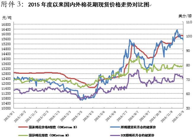 基本面方面,美國農(nóng)業(yè)部報告顯示,2016年11月25日-12月1日,2016/17年度美棉出口凈簽約量為9.19萬噸,創(chuàng)年度新高,較前周大幅增長,較前四周平均值增長93%。USDA最新產(chǎn)需預(yù)測顯示,2016/17年度全球產(chǎn)量和期末庫存增加,其中美棉產(chǎn)量增加,美國國內(nèi)棉花消費量減少,出口量和期末庫存增加。本周,美國國內(nèi)七大市場M級現(xiàn)貨平均價格73.9美分/磅,較前周下跌0.32美分/磅。