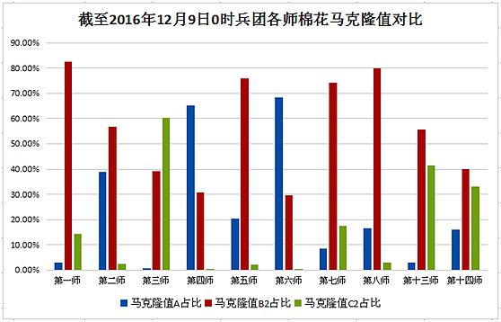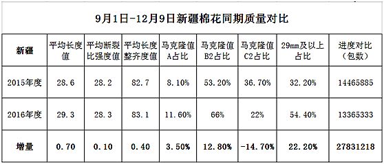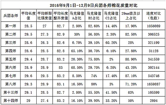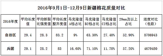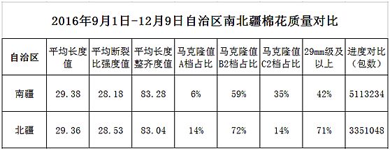 據(jù)全國(guó)棉花加工檢驗(yàn)數(shù)據(jù)平臺(tái)統(tǒng)計(jì),2016年度新疆棉花質(zhì)量趨于穩(wěn)定,較上周并無(wú)明顯變化。本年度新疆棉花質(zhì)量好于去年,自治區(qū)棉花與兵團(tuán)的棉花質(zhì)量差距縮小,自治區(qū)北疆棉花質(zhì)量好于自治區(qū)南疆。截至2016年12月9日,本年度新疆棉花質(zhì)量狀況如下: