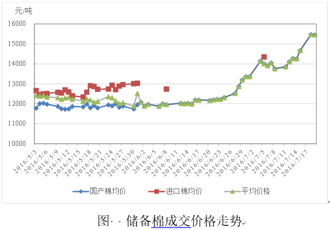 儲(chǔ)備棉出庫(kù)價(jià)快速上漲。近期儲(chǔ)備棉每日掛牌競(jìng)拍量有所增加,但仍難以滿足市場(chǎng)需求,紡企棉花采購(gòu)難度較大。截至7月20日,2015/2016年度儲(chǔ)備棉累計(jì)計(jì)劃出庫(kù)144.97萬(wàn)噸,累計(jì)出庫(kù)成交142.32萬(wàn)噸,其中國(guó)產(chǎn)棉累計(jì)成交112.69萬(wàn)噸,進(jìn)口棉累計(jì)成交29.63萬(wàn)噸,累計(jì)成交平均長(zhǎng)度為28.3mm,成交平均價(jià)格為12815元/噸。最近一周銷售底價(jià)為13609元/噸,較上月底價(jià)大幅上漲超過(guò)1000元/噸,較最低競(jìng)拍底價(jià)上漲1770元/噸。
