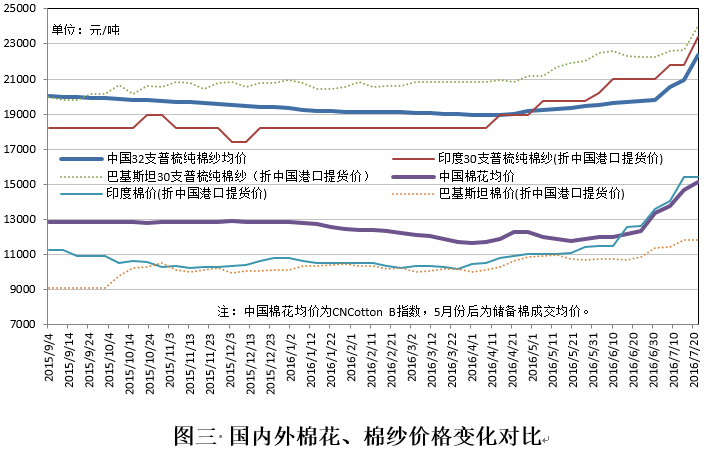 從國內(nèi)看,經(jīng)過6月底以來的快速上漲和補漲,到7月下旬,儲備棉成交均價與32支純棉普梳棉紗價差再次回升至7000-8000元/噸左右的近年較高水平。從國際看,4月以來國產(chǎn)32支純棉普梳紗與印度、巴基斯坦同檔次棉紗價格的對比關系也發(fā)生改變,印巴紗已上漲至國產(chǎn)紗價以上,同檔次國產(chǎn)棉紗已占據(jù)價格競爭優(yōu)勢。