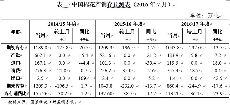 近日,國家棉花市場監(jiān)測系統(tǒng)結(jié)合相關歷史數(shù)據(jù),對產(chǎn)銷存平衡情況進行系統(tǒng)梳理,將2015年度期初庫存下調(diào)至1209萬噸,消費上調(diào)至756.2萬噸,期末庫存下調(diào)至1043.8萬噸,庫存消費比137.6%,同比降低17.7個百分點;2016年度國內(nèi)棉花產(chǎn)量483.9萬噸,同比減少37.7萬噸,消費755.4萬噸,同比基本持平,期末庫存降至860萬噸,庫存消費比113.7%,同比下降24個百分點。其他年度紡織用棉、庫存變化等也進行了相應調(diào)整。