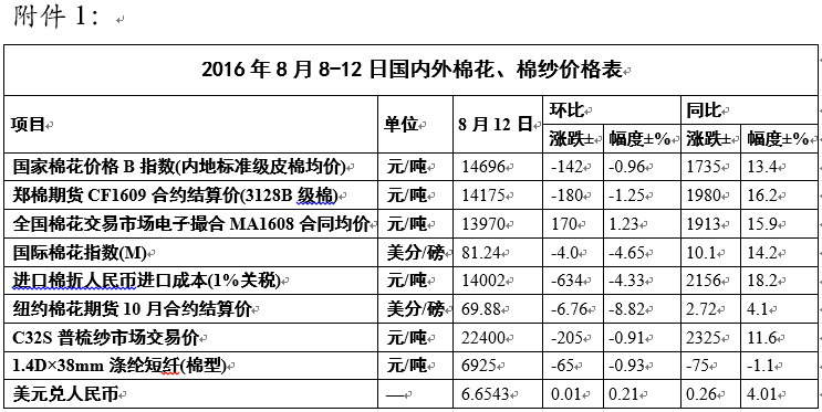 本周,國(guó)內(nèi)棉花期現(xiàn)貨價(jià)格震蕩走低。8月12日,內(nèi)地標(biāo)準(zhǔn)級(jí)皮棉銷售均價(jià)14696元/噸,較上周下跌142元/噸,跌幅0.96%,同比上漲1735元/噸,漲幅13.4%。鄭州棉花期貨9月合約結(jié)算價(jià)14175元/噸,較上周下跌180元/噸,跌幅1.25%,同比上漲1980元/噸,漲幅16.2%。全國(guó)棉花交易市場(chǎng)電子撮合交易8月合同均價(jià)13970元/噸,較上周上漲170元/噸,漲幅1.23%,同比上漲1913元/噸,漲幅15.9%。