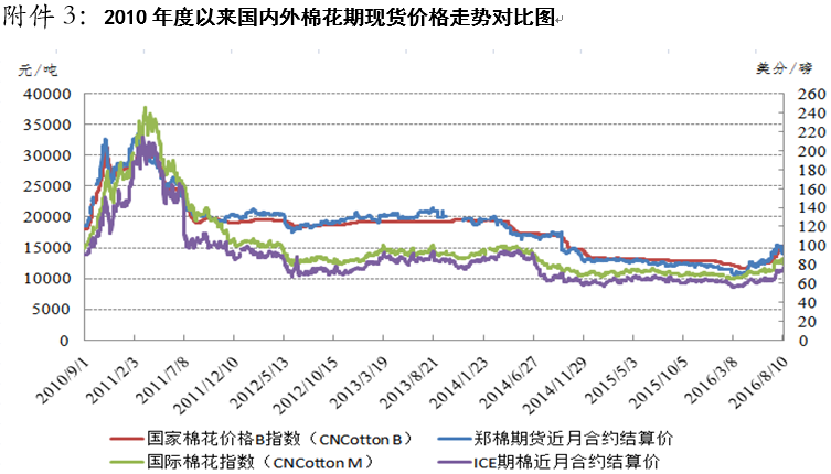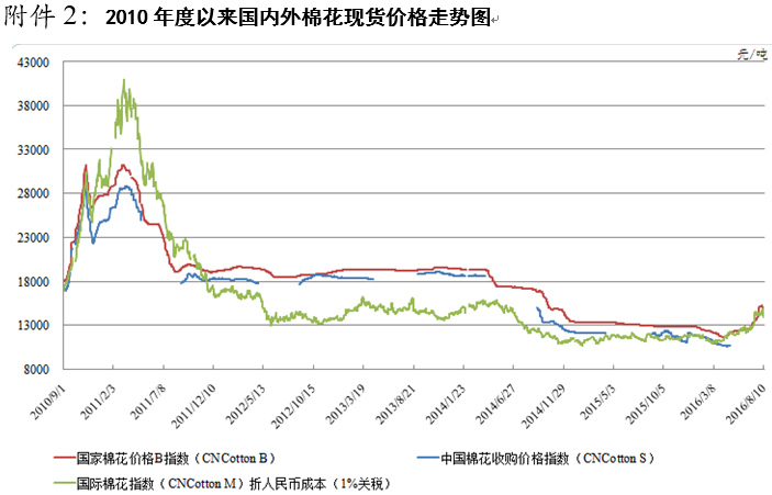 基本面方面,8月8-12日,中國(guó)儲(chǔ)備棉管理總公司計(jì)劃出庫銷售儲(chǔ)備棉15.01萬噸,實(shí)際成交9.27萬噸,全部為國(guó)產(chǎn)棉,成交率61.77%。截至2016年8月12日,2015/2016年度儲(chǔ)備棉累計(jì)出庫成交179.47萬噸,其中國(guó)產(chǎn)棉成交149.86萬噸,進(jìn)口棉成交29.61萬噸。