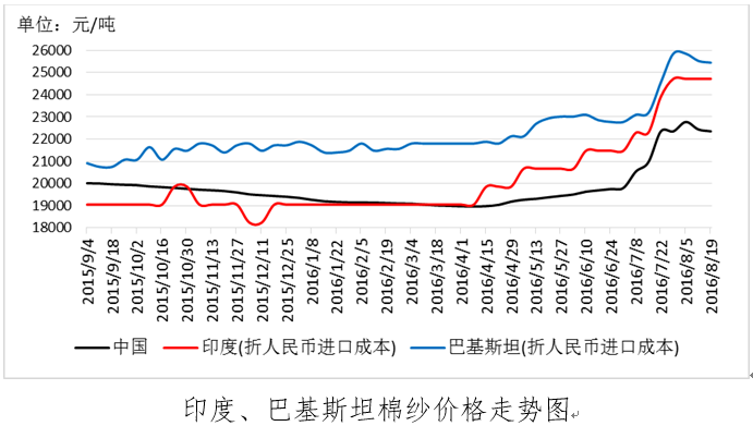 2016年8月15-19日,國(guó)內(nèi)32支普梳純棉紗周均價(jià)22352元/噸,環(huán)比上漲2元/噸;印度國(guó)內(nèi)30支普梳純棉紗周均價(jià)3美元/公斤,環(huán)比上漲0.1美元/公斤,漲幅3.5%,折人民幣進(jìn)口成本24720元/噸,較國(guó)內(nèi)32支普梳純棉紗高2368元/噸;巴基斯坦國(guó)內(nèi)30支普梳純棉紗周均價(jià)3.09美元/公斤,環(huán)比下跌0.05美元/公斤,跌幅1.6%,折人民幣進(jìn)口成本25450元/噸,較國(guó)內(nèi)32支普梳純棉紗高3098元/噸。